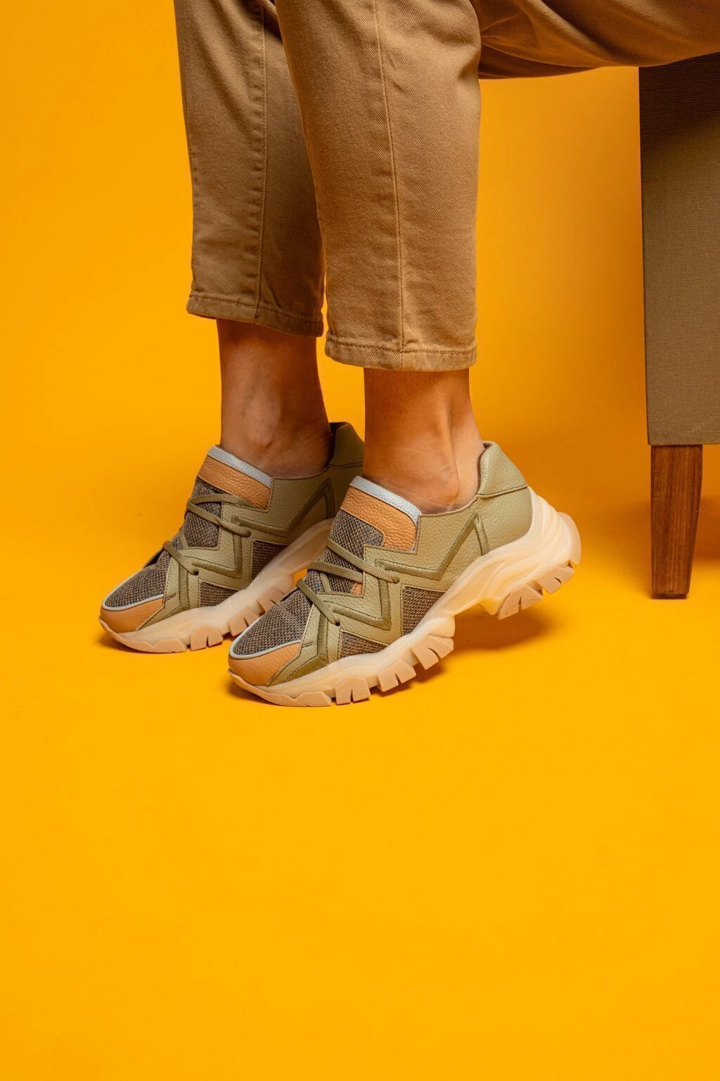 Zapatillas con combinación de cueros de diferentes tonos y tela deportiva. En el lateral tiene un bordado a tono del cuero que desarrollamos exclusivamente para esta colección. Acceso mediante cordones de algodón a tono. Horma amplia. Recomendamos llevar un talle menos al habitual.