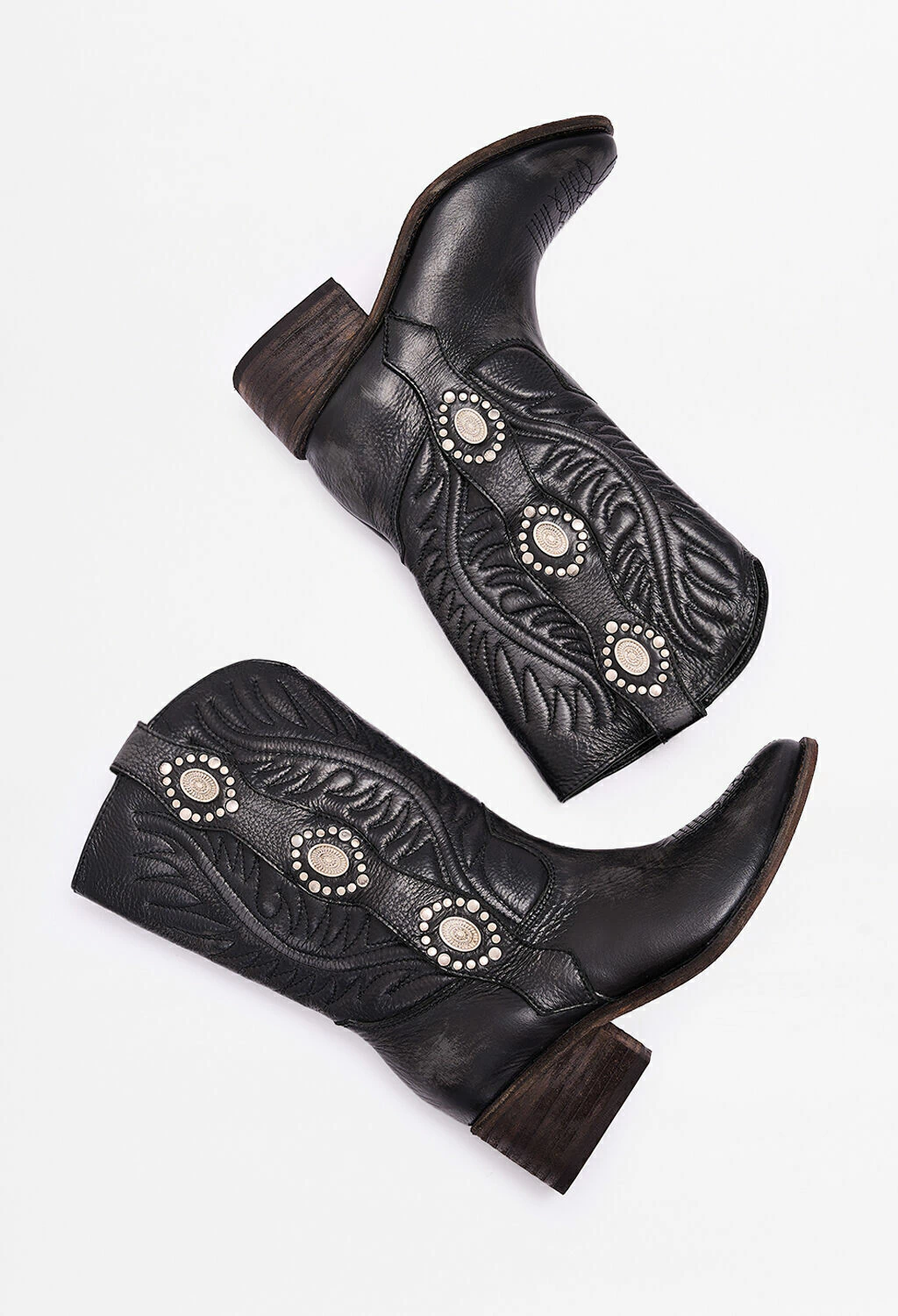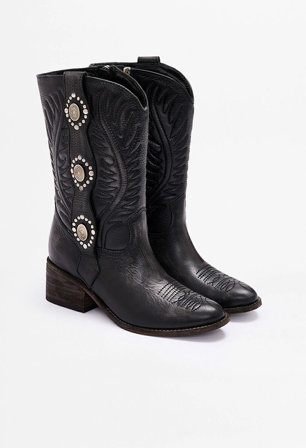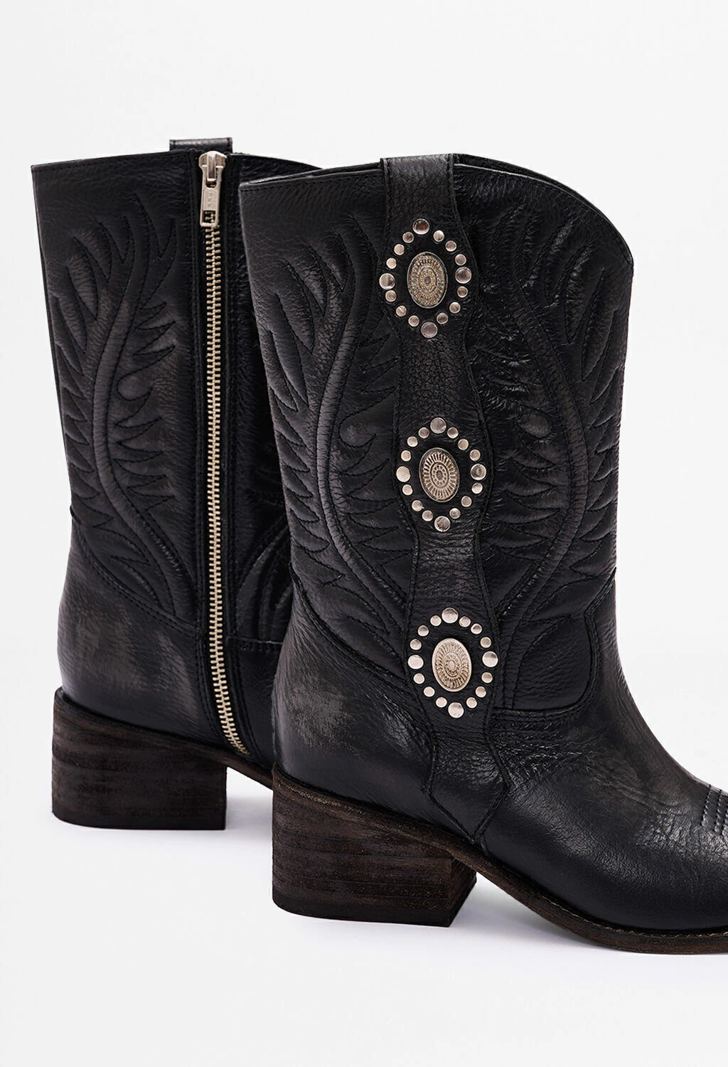 Bota texana de caña media. El cuero tiene un leve gastado sectorizado. En el lateral externo tiene costuras con efecto matelaseado y una faja de cuero con remaches color niquel y apliques ovalados diseñados exclusivamente. El acceso es mediante cierre metálico. El forro es 100% cuero vacuno.