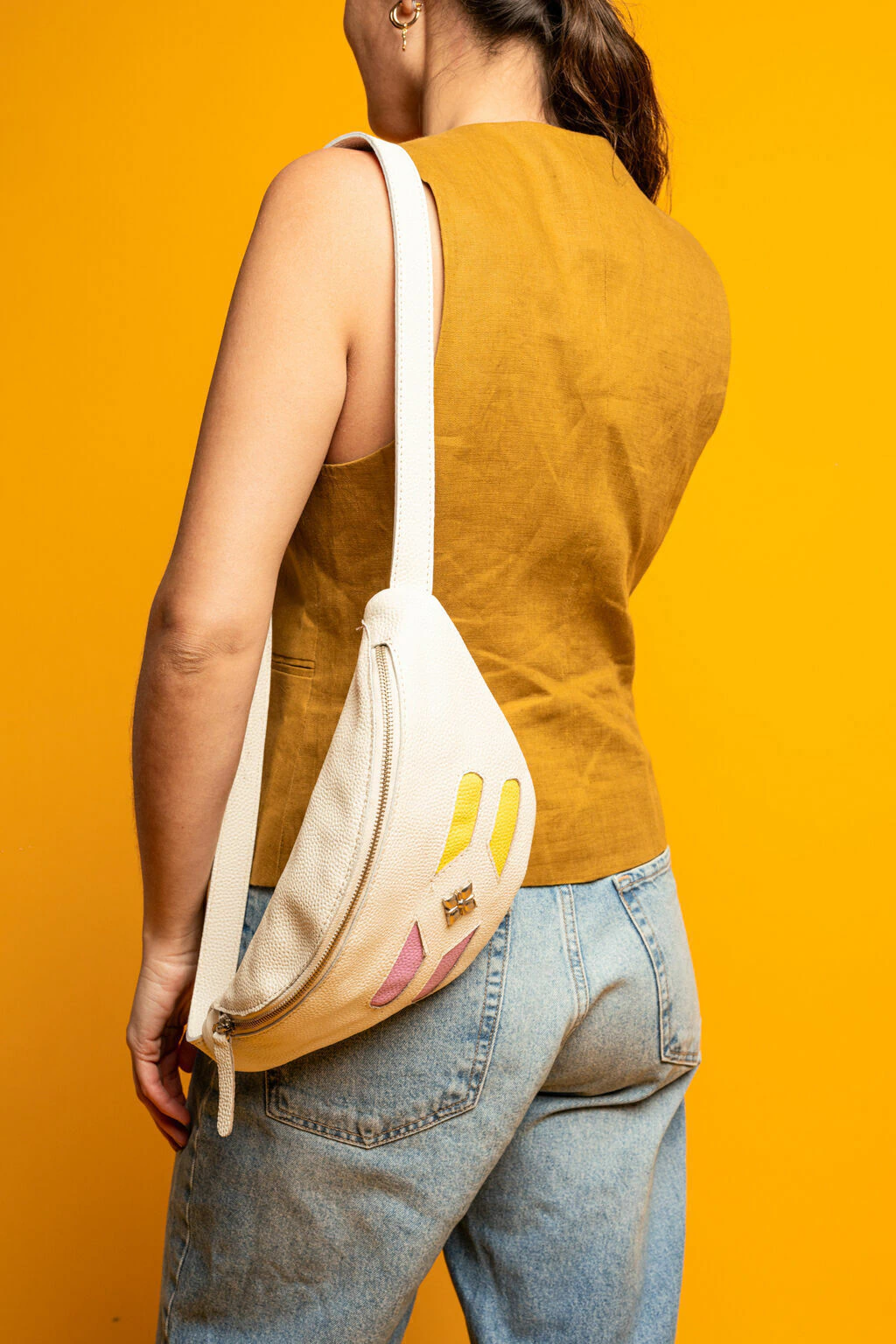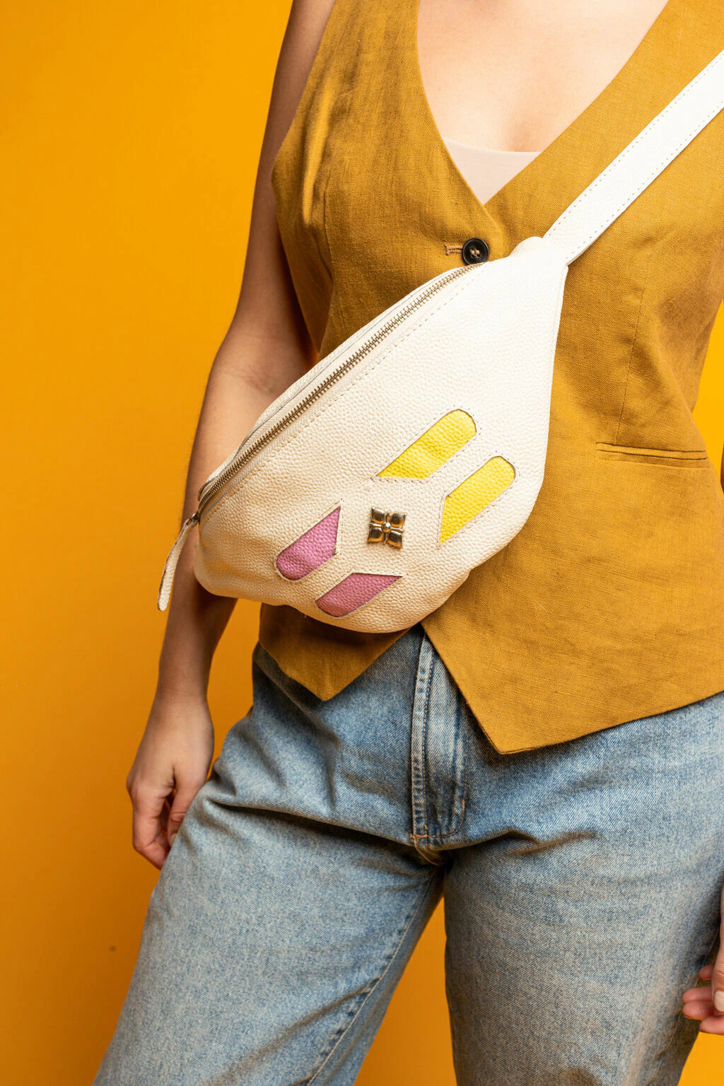 Riñonera de cuero. En el frente tiene calados que muestran un cuero a contra tono que asoma por abajo y un herraje de flor que desarrollamos exclusivamente para esta colección. Acceso mediante cierre metálico. Correa regulable tipo cinturón.